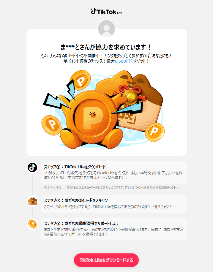 上記の通り、今までTikTokLite(ティックトックライト)の参加をしていない18歳以上の人であれば誰でも参加可能な大盤振る舞いのキャンペーンです。