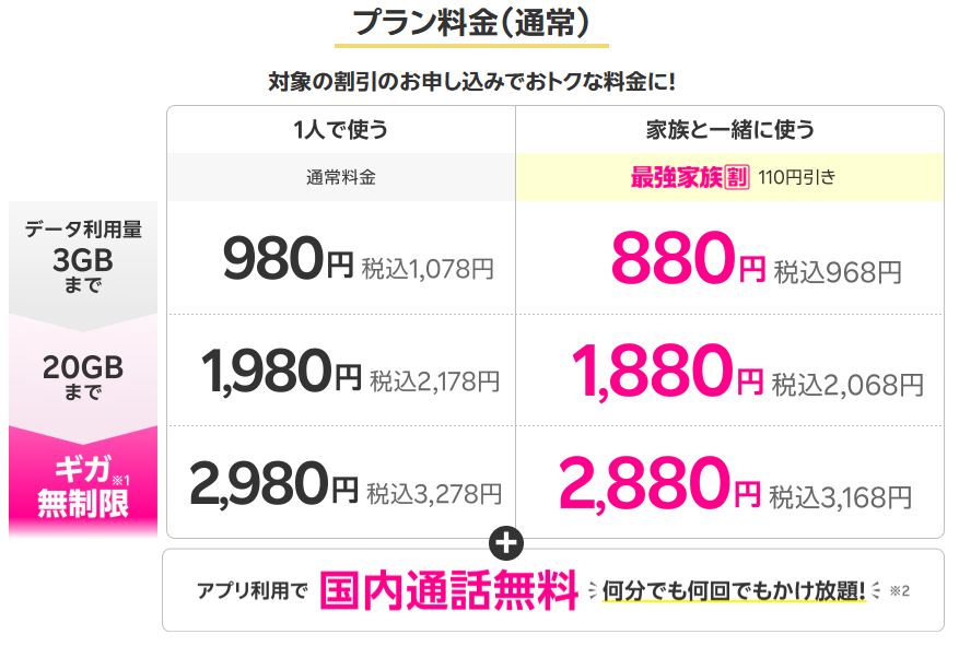 プランは下記の通り、データ通信量によって異なりますが、20GB以上を利用する人は、2,980円で使い放題なのでお金を気にせず通信が可能です。