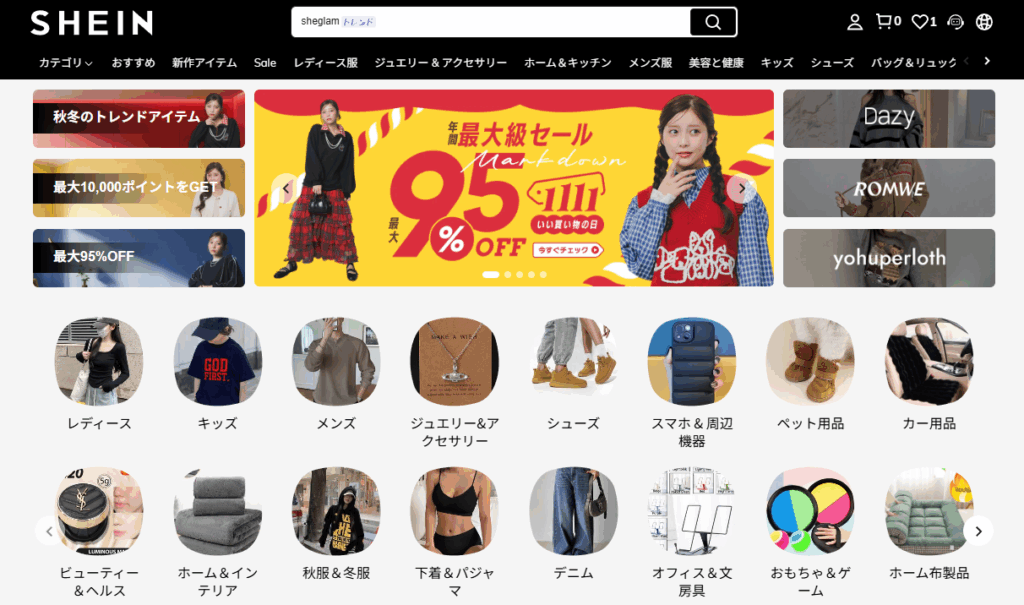 SHEINにアクセスしていただくと分かる通り、トップページでは「11.11年間最大級のセール」として最大95%割引で商品が買えるキャンペーン実施中となっています。