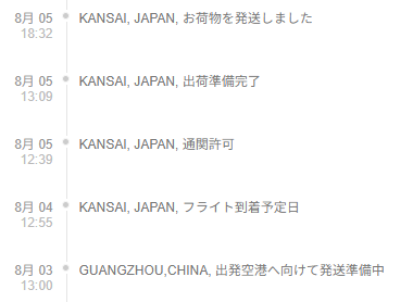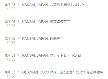 追跡画面を見ると、中国(GUANGZHOU,CHINA)から関西国際空港に到着したことが分かります。