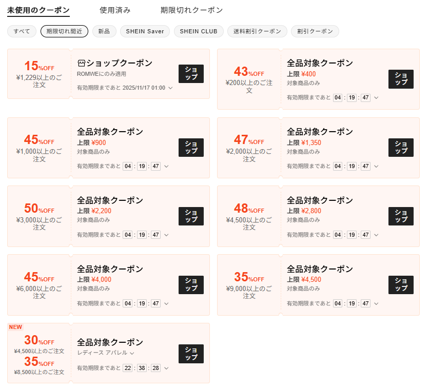 SHEINでは、新規アカウント登録時に色々なクーポンが配布されます。