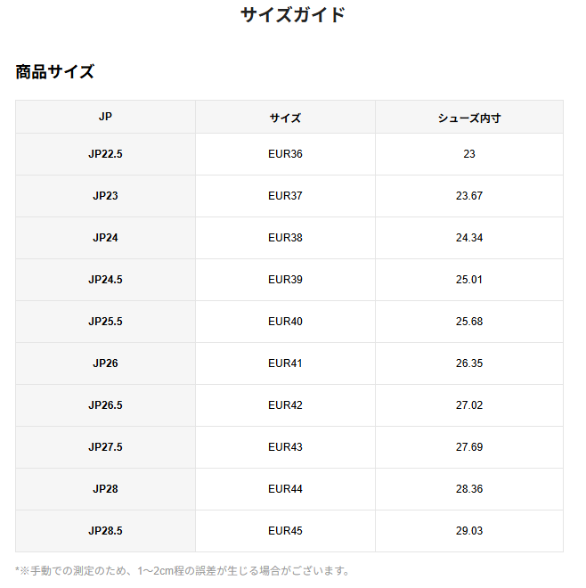SHEINの靴のサイズ(cn・eur・us)は何センチなのか分からない人は、下記の表を参考にしてください。