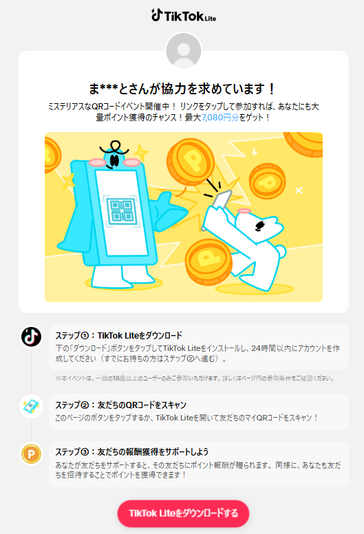 TEMUの気持ち悪いと感じた広告の消し方を知った人に教えたいお得なポイ活アプリ「ティックトックライト」獲得手順2つ目が「招待からアプリをダウンロード」です。