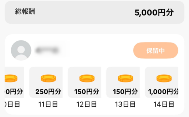画像の通り、指定された日数分15秒の動画を見ると合計5000円分のポイントが獲得できます。