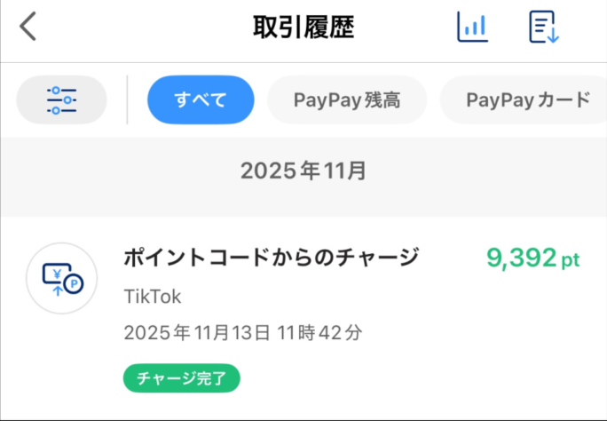 ●PayPayポイントを交換した場合、正常に完了すると下記の通りPayPayアプリの取引履歴に表示されます。