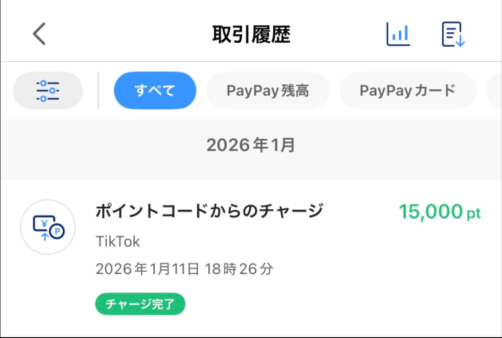 例えば、「PayPayポイント」に交換した場合、正常完了するとPayPayアプリの取引履歴に交換ポイントが載ります。